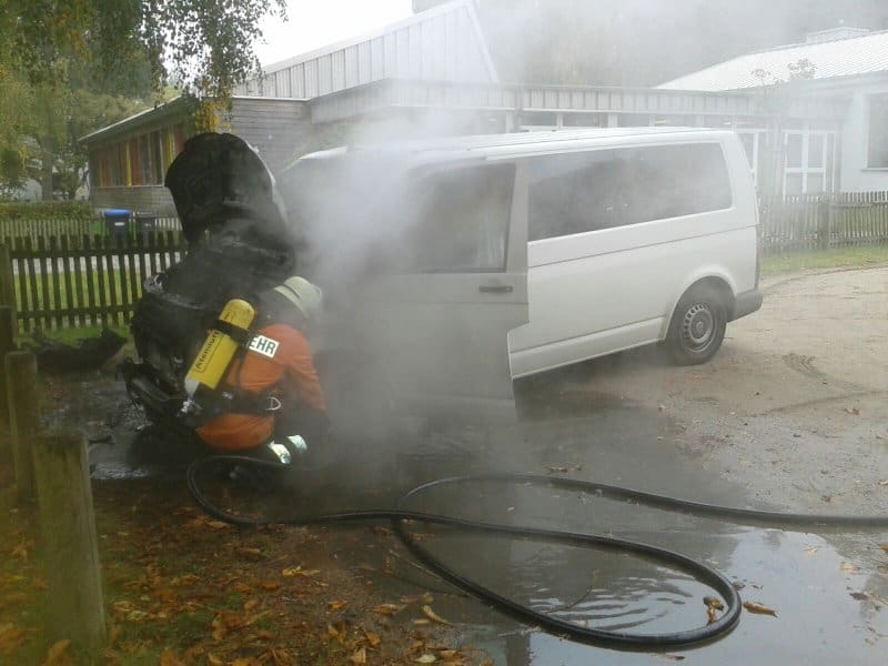 Brennt Kleinbus, ein Trupp unter Atemschutz,
