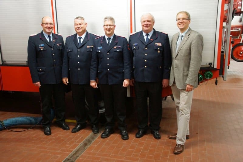 Foto, von links: Kreisbrandmeister Torsten Hensel, 1. Stellv. Stadtbrandmeister Hermann Blanquett, 2. Stellv. Stadtbrandmeister Joachim Meins, Stadtbrandmeister Henning Banse und Bürgermeister Jens Böther