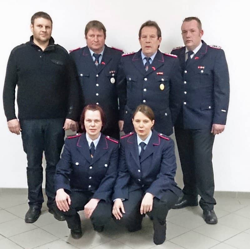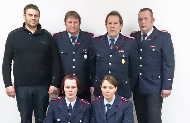hinten von links: Oliver Neumann, Ortsbrandmeister Joachim Golly, Heinrich Hornig, Stellv. Ortsbrandmeister Florian Hornig, vorne von links: Nicole Oestreich und Jessica Ivert