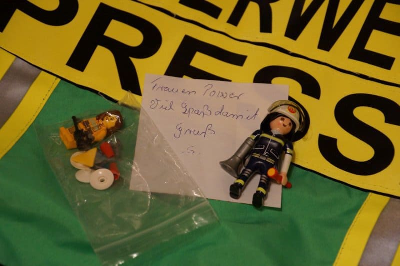 Heute hatte ich eine weitere Playmobil-Feuerwehrfrau, eine Lego-Feuerwehrfrau und einen Zettel im Briefkasten.