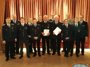 Foto 1, von links: Ortsbrandmeister Thorsten Meyer, Stadtbrandmeister Henning Banse, Domenic Gnibba, Christa Schulze, Christoph Götz, Sascha Rutzen, Wilhelm Spittau, Thorge Meyer, Manfred Kruse, Ines Gnibba, Bürgermeister Jens Böther, Tobias Meyer und Stellv. Ortsbrandmeister Hans-Wilhelm Eilmann