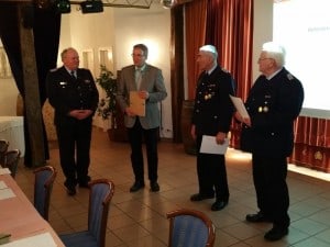 Foto 2, von links: Stadtbrandmeister Henning Banse, Bürgermeister Jens Böther, Wilhelm Spittau und Manfred Kruse