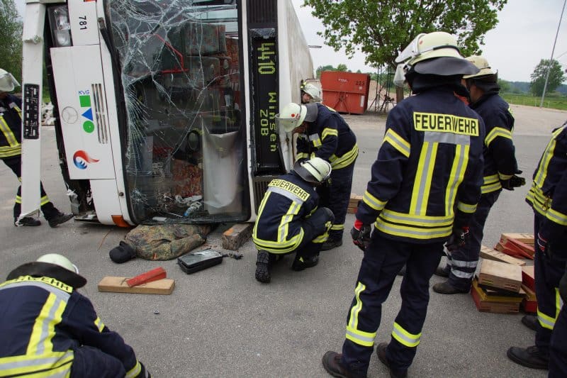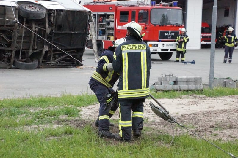 Der ausgemusterte Linienbus wurde nach der Alarmübung im April auf dem Übungsgelände am Feuerwehrhaus abgestellt. Heute wurde der Bus umgekippt und diente als Übungsobjekt für die Ausbildung mit hydraulischen Rettungsgeräten, Seilwinde und Hebekissen.