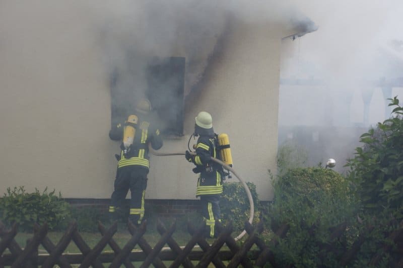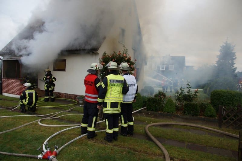 Die Feuerwehren Bleckede, Breetze und Garze wurden um 12:52 zu einem Gebäudebrand mit Menschengefährdung in den Kiefernweg in Bleckede alarmiert. Beim Eintreffen der ersten Einsatzkräfte schlugen die Flammen bereits aus Fenster und Dach.