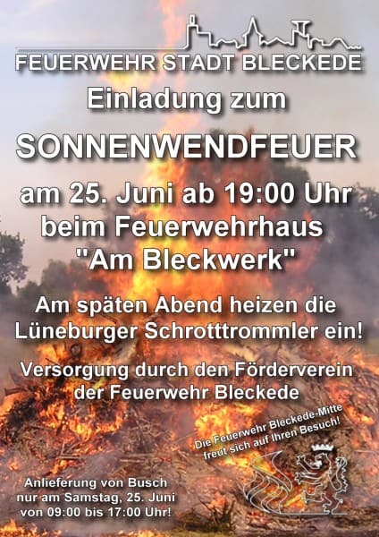 Die traditionellen Sonnenwendfeuer in Brackede und Bleckede werden am nächsten Samstag ab 19:00 entzündet.
