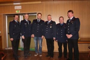 Foto, von links: Ortsbrandmeister Rainer Kastens, Stellv. Stadtbrandmeister Joachim Meins, Tim Rechenberg, Jürgen Hubert, Erhard Popp und Gerald Grünhage