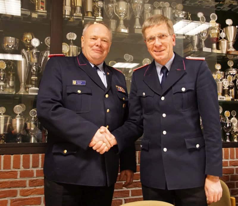 Foto 1, von links: Stadtbrandmeister Henning Banse gratuliert Ortsbrandmeister Friedhelm Hinrichs direkt nach der Wahl