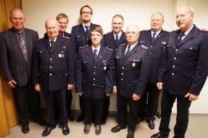 Foto 1, von links: Stellv. Bürgermeister Herbert Beusch, Helmut Lühr, Ortsbrandmeister Friedhelm Hinrichs, Sandro Nickelt, Yvonne Brück, Daniel Dreyer, Manfred Michels, Stadtbrandmeister Henning Banse, Ortsvorsteher Wilhelm Kastens
