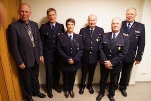 Foto 2, Ehrungen, von links: Stellv. Bürgermeister Herbert Beusch, Ortsbrandmeister Friedhelm Hinrichs, Yvonne Brück, Helmut Lühr, Manfred Michels und Stadtbrandmeister Henning Banse
