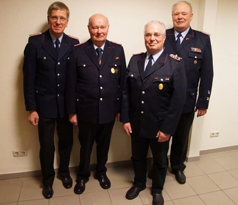 Foto 3, Ehrungen Senioren, von links: Ortsbrandmeister Friedhelm Hinrichs, Helmut Lühr, Manfred Michels und Stadtbrandmeister Henning Banse