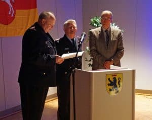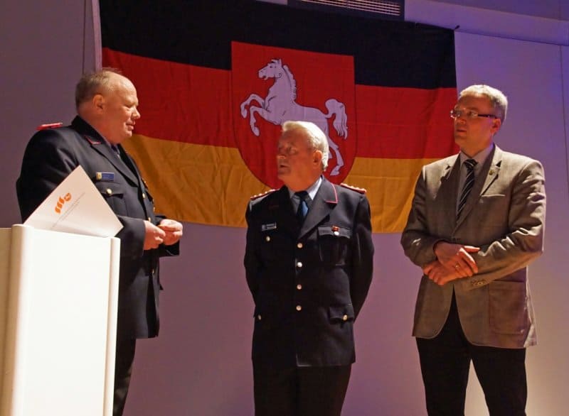 Fotos, von links: Stadtbrandmeister Henning Banse, Ehrenstadtbrandmeister Wilhelm Warner und Bürgermeister Jens Böther