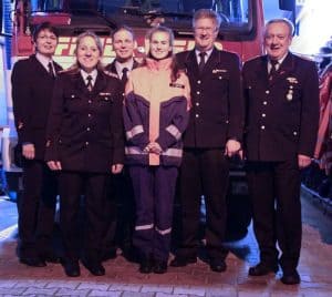 Foto 2, von links: Barbara Foelske, Stadtjugendfeuerwehrwartin Susanne Kluge, Stellv. Stadtjugendfeuerwehrwart Henrik Schulz, Jugendsprecherin Lea Meins, Stellv. Stadtbrandmeister Joachim Meins und Helmut Steckelberg