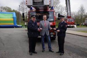 Foto 2: Schlüsselübergabe, von links: Stadtbrandmeister Henning Banse, Bürgermeister Jens Böther und Ortsbrandmeister Joachim Meins
