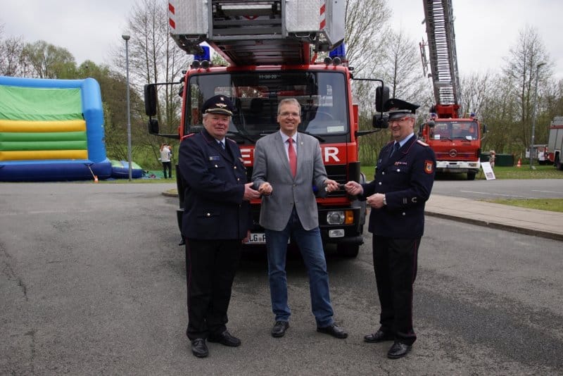 Bürgermeister Jens Böther übergab die Schlüssel für das Gebäude, das Mannschaftstransortfahrzeug und die Drehleiter an Stadtbrandmeister Henning Banse und Ortsbrandmeister Joachim Meins. Danach folgte eine Führung durch das Gebäude.