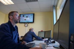 Örtliche Einsatzleitung im ehemaligen Jugendfeuerwehrraum – Ausstattung: Vier PC-Arbeitsplätze, drei Funkgeräte, großer Bildschirm für Lagedarstellung, Serverraum, Telefonanlage, Einsatz-Verwaltungssoftware ELS-Pro