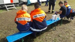 Heute Morgen hatte die Jugendfeuerwehr Bleckede „Toilettendienst“ – auch das gehört zum Zeltlager: Jede Gruppe muss bei den Sanitäranlagen und bei der Verpflegungsausgabe helfen.