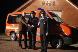 Bürgermeister Jens Böther und Stadtbrandmeister Henning Banse übergaben den von der Feuerwehr umgebauten Neunsitzer an Ortsbrandmeister Thorsten Meyer.