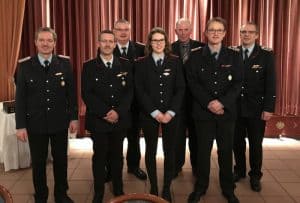 Ortsbrandmeister Thorsten Meyer, Stefan Roselandt, stellv. Stadtbrandmeister Hermann Blanquett, Marieke Andersson, stellv. Bürgermeister Herbert Beusch, Sascha Rutzen und stellv. Ortsbrandmeister Hans-Wilhelm Eilmann