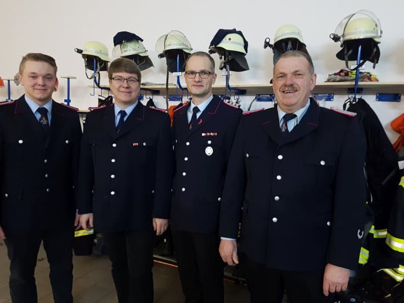 Jonas Schulz, Mario Becker, Cord Dräger und Ortsbrandmeister Burkhard Popp