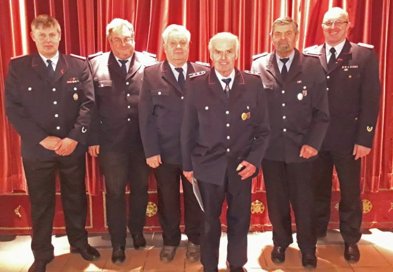 Foto 1, von links: Ortsbrandmeister Ralf Bullmann, Hartmut Müller, Peter Schwarz, Manfred Schardin, Udo Achterberg und Kreisbrandmeister Torsten Hensel.