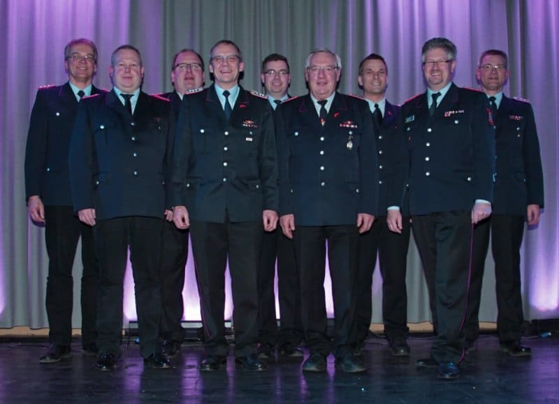 Foto, von links: Bürgermeister Jens Böther, Jan Mählmann, Olaf Jenkel, Hans-Wilhelm Eilmann, Heiko Deetz, Helmut Steckelberg, Henning Wanke, Stadtbrandmeister Joachim Meins und Carsten Schmidt