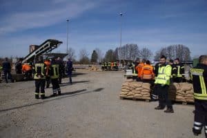 Bei der praktischen Ausbildung wurden die Handgriffe bei der Sandsackabfüllung mit der Sandsackfüllmaschine des Landkreises, mit Rohrschaufeln sowie weiteren manuellen Geräten und Vorrichtungen geübt. Über 300 Sandsäcke wurden für die folgenden Ausbildungseinheiten gefüllt und auf Paletten gepackt – alles wie im Hochwassereinsatz.