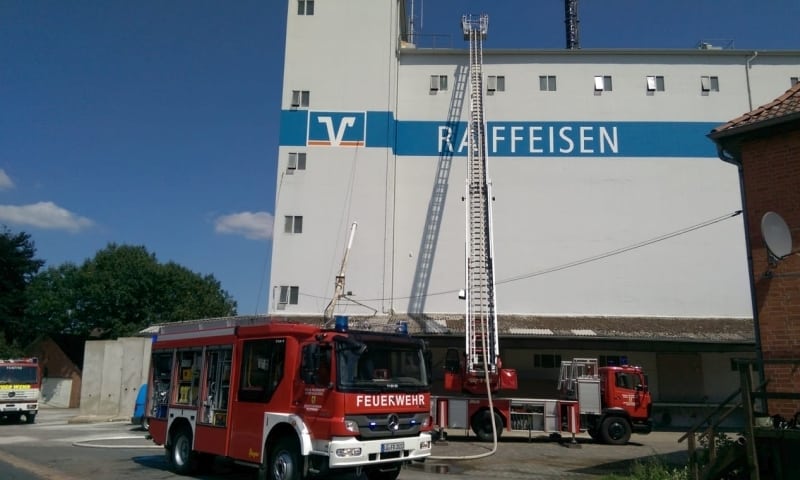 Weitere Anlagenteile der Getreideförderstrecke mussten aufwändig demontiert und abgelöscht werden. Die Drehleiter diente zur Wasserförderung in das Obergeschoss und zum kräfteschonenden Transport der Atemschutzgeräteträger.