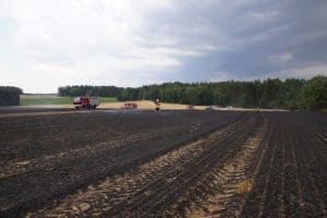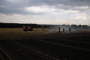 Es brannten fünf bis sechs Hektar Stoppelacker. Die Flammen wurden durch den auffrischenden Wind (aktuelle Unwetterwarnung Gewitter/ Sturm des DWD) angefacht.