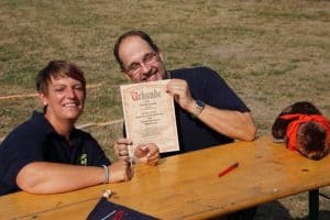 Foto 1: Kinderfeuerwehrwart „Eystrup und Umgebung“ Marcus Ullrich und Kinderfeuerwehrwartin Walmsburg Yvonne Brück tauschen Wimpel und Biber