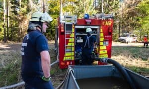 Aufgrund dieser Lageentwicklung werden zwei Wasserförderzüge durch die Einsatzleitung in den Einsatz gebracht. Vom Forsthaus Röthen wurde eine Förderstrecke zu der betreffenden Abteilung aufgebaut, um eine effiziente Brandbekämpfung durchzuführen.