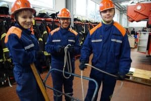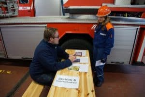 Feuerwehrtechnische Geräte wie Verteiler und Strahlrohre wurden erklärt und Fragen zu Schläuchen und Mülltrennung beantwortet. Das richtige Aus- und Aufrollen von Schläuchen sowie Knoten und Stiche waren die praktischen Prüfungselemente.