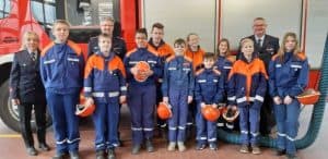 Foto 5: Stadtjugendfeuerwehrwartin Susanne Kluge (links) mit den erfolgreichen Teilnehmern der Jugendflammenprüfung. Links vorne Ari Wolter und Julian Dreger mit voller Punktezahl