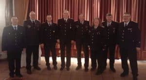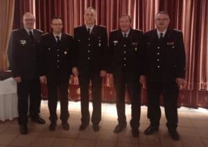 Foto 2, Ehrungen: Kreisbrandmeister Thorsten Hensel, Andreas Meyer, Jürgen Janssen, Horst – Dieter Hanelt und Stellv. Stadtbrandmeister Hermann Blanquett