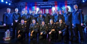 Hintere Reihen: Stadtbrandmeister Joachim Meins, Stellv. Kreisbrandmeister Stephan Dick, Henning Wanke, Andre Berdien, Sebastian Gödecke, Andreas Ströse, Henrik Soetbeer, Hauke Koerth, Anitha Müller, Michael Meyer, Oliver Schmidt, Reinhard Kommert, Stellv. Bürgermeister Herbert Beusch, Joachim Ries, Jan-Hinrich Wiswe, Ortsbrandmeister Lorenz Reimers und Stellv. Ortsbrandmeister Carsten Schmidt