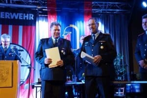 Stadtbrandmeister Joachim Meins wurde für seine Zeit als Ortsbrandmeister mit einem Präsent geehrt.