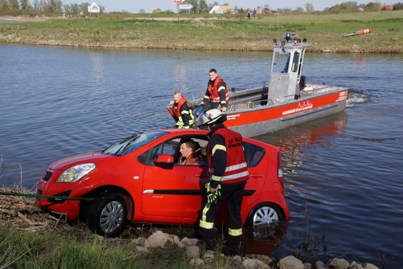 Im Bereich der Hafeneinfahrt war ein roter Suzuki Splash aus ungeklärter Ursache ins Hafenbecken gefahren. Der mit zwei Senioren besetzte PKW begann sofort zu sinken – drei beherzte Ersthelfer sprangen ins Wasser und retteten die Insassen.