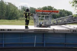 Das Übungsobjekt war die „Ideal 2“. Das Binnenschiff lag in der Mitte des Hafens und war für die Einsatzkräfte nicht erreichbar. Mit dem Mehrzweckboot setzten erste Atemschutzgeräteträger über – die Bordwand musste mittels Leitern überwunden werden. Insgesamt waren auf dem Schiff drei Vermisste, die ans Ufer gebracht werden mussten. Die Rettung erfolgte per Boot, per Drehleiter und nach der Sicherung des Havaristen über den Steg.