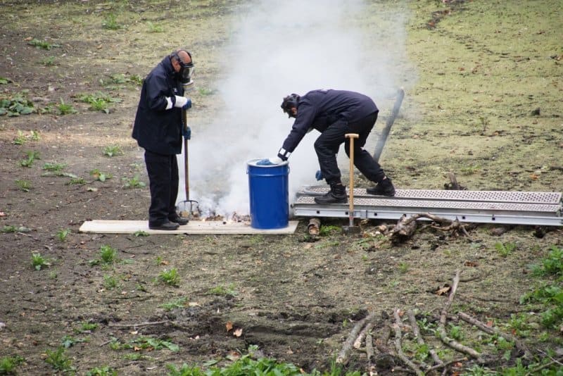 Um 18:00 Uhr traf der Kampfmittelräumdienst an der Einsatzstelle ein. Die Spezialisten konnten eine alliierte Phosphorhandgranate (PhosphorHANDgranate ist richtig!) bergen und in einem Fass sicher verpacken.