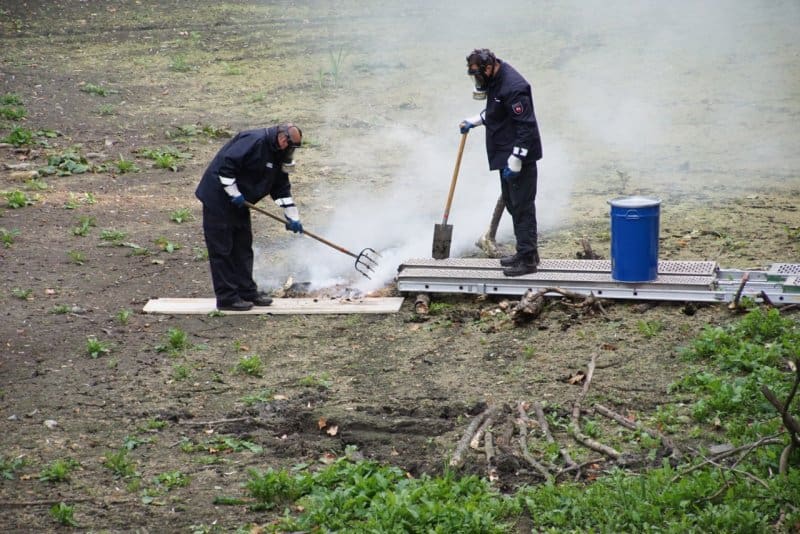 Um 18:00 Uhr traf der Kampfmittelräumdienst an der Einsatzstelle ein. Die Spezialisten konnten eine alliierte Phosphorhandgranate (PhosphorHANDgranate ist richtig!) bergen und in einem Fass sicher verpacken.