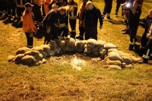 Die eine Übung wurde am Übungsdeich am Bleckeder Feuerwehrhaus durchgeführt. Während die Führungskräfte eine Kurzanleitung über das Thema Deichverteidigung bekamen, lernten die Mannschaften verschiedene Techniken zum Füllen eines Sandsackes. Einige hundert Sandsäcke galt es zu füllen, denn diese mussten bei den anschließenden Übungen verbaut werden. Bei den Übungen stand aber nicht die schwere körperliche Arbeit im Vordergrund, sondern die Technik: wie verbaue ich einen Sandsack richtig, wohin muss die Öffnung zeigen und wie entsteht ein Wall sicher und solide, aber auch der wichtige Hinweis, dass es normal ist, wenn Wasser aus dem Deich sickert, und auch zu erkennen, ab wann Gefahr droht.