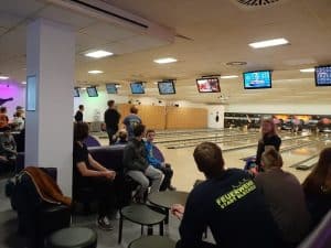 Weihnachtsfeier mit Bowling und Pizza.