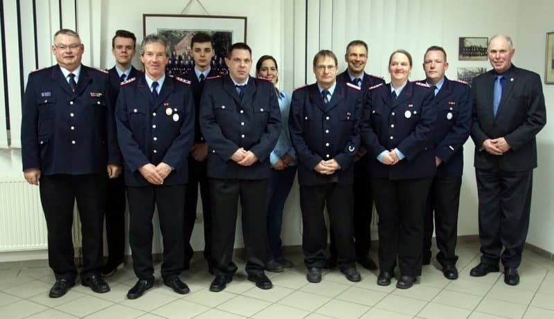 Foto 1, von links: Stadtbrandmeister Hermann Blanquett, Mika Börstling, Volker Hagemann, Felix Kluth, Jens Klein, Mandy Burmester, Ortsbrandmeister Joachim Golly, Michael Nottebohm, Nicole Dahms, Florian Hornig und Stellv. Bürgermeister Herbert Beusch