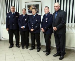Foto 2, von links: Stadtbrandmeister Hermann Blanquett, Nicole Dahms, Joachim Golly, Florian Hornig und Stellv. Bürgermeister Herbert Beusch