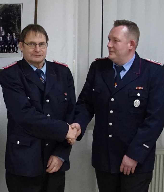 Foto 3, von links: Ortsbrandmeister Joachim Golly mit seinem Nachfolger Florian Hornig