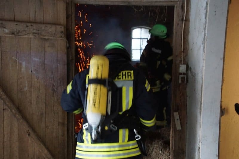 Aus ungeklärter Ursache brannten Strohreste auf dem Dachboden – das Brandgut wurde unter Atemschutz abgelöscht.