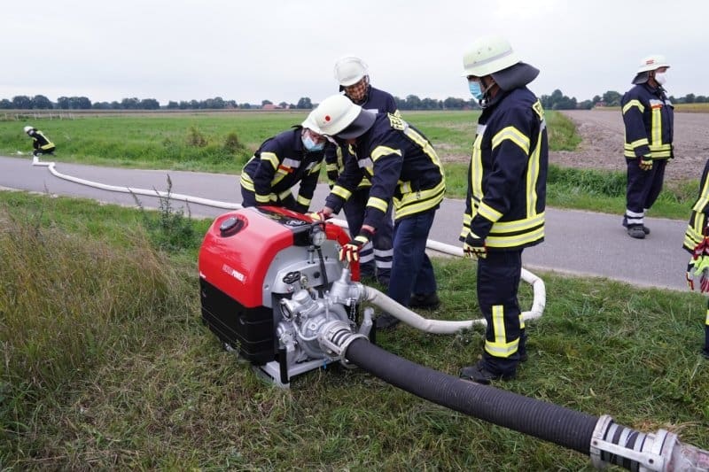 Das neue Gerät verfügt über einen Elektrostarter. Darüber freut sich besonders Stellv. Ortsbrandmeisterin Barbara Foelske: „Jetzt können auch die Frauen in der Feuerwehr mit der Pumpe arbeiten – mit dem alten Gerät war das starten des Motors die größte Hürde …“