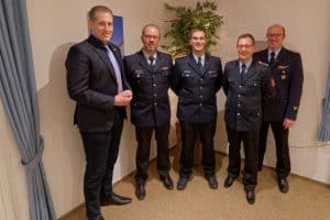 Bürgermeister Dennis Neumann, Lorenz Reimers, Henning Wanke, Falk Bardenhagen und Kreisbrandmeister Torsten Hensel