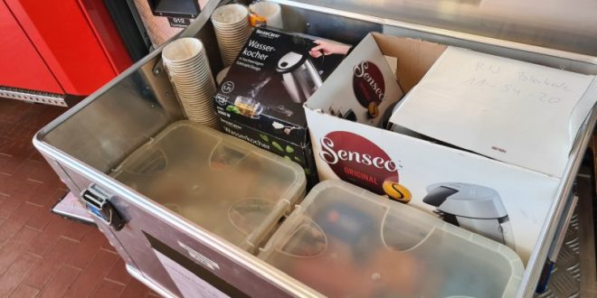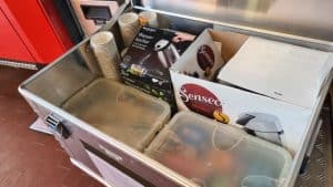 Maschine geprüft – Kaffee und Tee aufgefüllt – Versorgungskiste einsatzbereit auf dem Rüstwagen verlastet:
