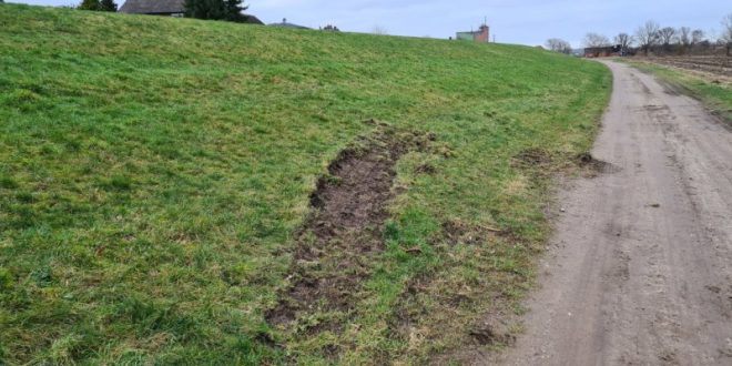 Leider wird der Deich aktuell nicht nur durch Wildschweine beschädigt – die leicht vermeidbaren Schäden entstehen durch Fahrzeuge.