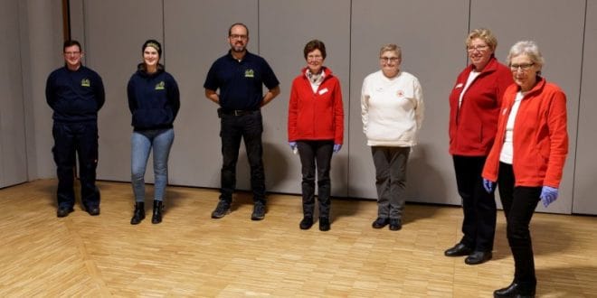 Foto, von links: Jugendfeuerwehrwart Leon Haemmerich, Kinderfeuerwehrwartin Lea Meins und Ortsbrandmeister Lorenz Reimers, das Team des DRK Ortsverein Bleckede: Gabriele Heilmann, Anne Behnke-Gawlik, Kerstin Drews und Sylvia Dienst.